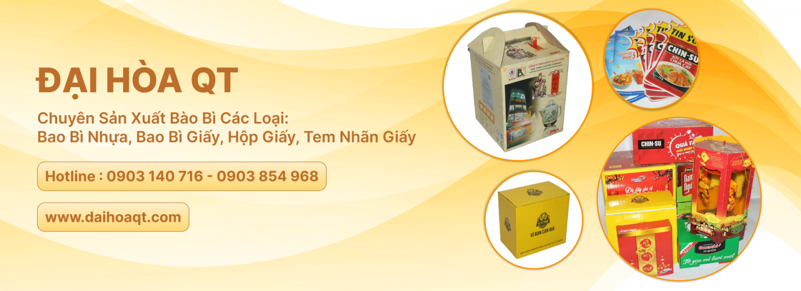 Công ty Đại Hòa QT thành lập năm 2014 đến nay đã trở thành một công ty chuyên sản xuất cung cấp Bao bì các loại như Bao bì nhựa mền phức hợp cao cấp đa lớp và bao bì giấy các loại: Hộp bìa cứng, hộp giấy, tem nhãn giấy. Phục vụ mọi lãnh vực bao gói hàng hóa trong cuộc sống hàng ngày để đem lại giá trị sản phẩm được nâng cao uy tín chất lượng trên thị trường trong nước và Quốc tế về mặt ngoại quan, trưng bày mà còn giữ cho chất lượng sản phẩm được bao gói bên trong được lâu hơn.